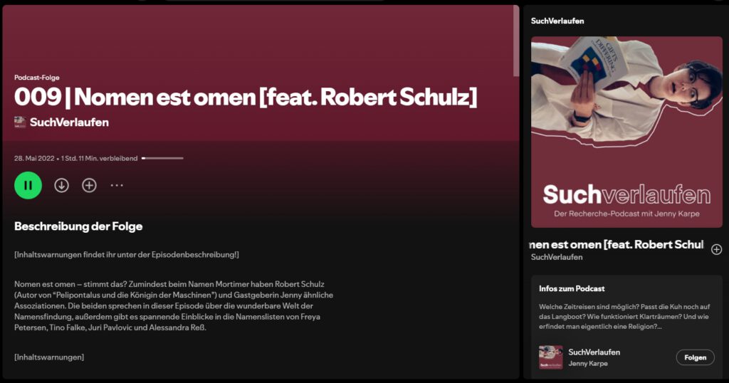Aus der Sendungsankündigung: „Nomen est omen – stimmt das? Zumindest beim Namen Mortimer haben Robert Schulz (Autor von “Pelipontalus und die Königin der Maschinen”) und Gastgeberin Jenny ähnliche Assoziationen. Die beiden sprechen in dieser Episode über die wunderbare Welt der Namensfindung, außerdem gibt es spannende Einblicke in die Namenslisten von Freya Petersen, Tino Falke, Juri Pavlovic und Alessandra Reß.„